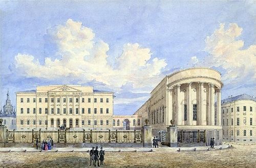 В первой половине XVII века этот участок переходил из рук в руки именитых владельцев – князя Черкасского, адмирала Апраксина, князя Долгорукова. После ссылки последнего усадьбу конфисковали и в 1737 году передали Медицинской коллегии, разместившей здесь Главную аптеку, во дворе усадьбы устроили аптекарские огороды, а ее правый (от входа) флигель заняла квартира аптекаря. Далее, в 1783 году отставной капитан-поручик Петр Егорович Пашков, сын денщика Петра Великого, разбогатевший на винных откупах, купил себе землю на Старых Ваганьках, где стоял когда-то загородный дворец Софьи Витовтовны, и пригласил архитектора В.И.Баженова построить роскошный дворец. Дворец вышел на славу – это знаменитый дом Пашкова, но хозяин недолго пожил в нем и перед смертью передал его во владение своему кузену Александру Ильичу Пашкову вместе с огромным долгом казне. Тому ничего не стоил его уплатить, ибо он был женат на Дарье Мясниковой, дочери уральского промышленника. Супруга его тотчас пожелала выстроить рядом на Моховой новую усадьбу для балов и театральных представлений. Ее, по легенде, возводил тот же Баженов в 1793 году, причем использовал старое здание Медицинской коллегии. И все же денег у них на два огромных дома не хватило, и в бывшем аптекарском флигеле Пашков сначала устроил конный манеж, а в 1806 году передал его в аренду Московскому императорскому театру. История театра в пашковском флигеле вызвала наибольшее количество спекуляций в недавнее время, поэтому коснемся ее.