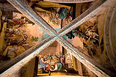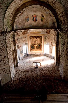 Самое ценное наследие монастыря – это фрески Никольского собора. По сохранившимся фрагментам можно судить, насколько красочными были интерьеры церкви. Во многих местах штукатурка осыпалась, обнажив кладку, и о том, какие сюжеты украшали их прежде, можно только догадываться. Однако там, где фрески еще целы, кажется, будто их только что отреставрировали. Краски поражают своей яркостью и сочностью, словно и высохнуть толком не успели. Похоже, что художник, расписывавший церковь, работал без особого плана, по наитию. Вот в завершенной и четко прописанной библейской сцене у ангелов замазаны рты – словно мастер оставил работу над ними на потом. Занимающей центральное место «Тайной вечере» время, кажется, вообще нипочем. В соседнем приделе контуры еще бледноваты, а дальше… кончилась штукатурка, но на голой стене тоже проглядывает орнамент. Чудо, убеждена настоятельница.