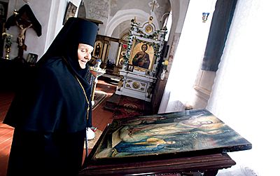 Чтобы собственными глазами увидеть то, о чем судачит вся губерния, нам пришлось изрядно потрястись по дорогам Подмосковья и Тверской области – монастырь находится примерно в трехстах километрах от Первопрестольной и в сорока – от райцентра Максатиха. Пока ехали, ведущий специалист по туризму Максатихинского района Геннадий Быков рассказывал нам о местных достопримечательностях. Его послушать, так здесь, в окрестностях Максатихи, чуть ли не всероссийская здравница. «Тут рядышком есть святой источник Параскевы Пятницы, – показывал наш спутник в сторону от дороги, – в нем вода целебная, помогает от всех желудочных заболеваний. А в обитель часто приезжают люди, которые не могут завести детей. Слух об иконе, которая от бесплодия помогает, распространился далеко. Многие потом возвращаются сюда, чтобы поблагодарить икону». Но мало этого, теперь к целебному источнику и чудотворной иконе могут добавиться «самовосстанавливающиеся» фрески.