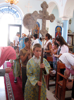 Дальше наш путь пролегает через городок Латакия на берегу Средиземного моря. Это древняя Лаодикия. Уже поздний вечер. Безуспешно пытаемся выяснить, во сколько служба в кафедральном соборе св. Георгия, действующем с VI века. Но в Сирии не пропадешь! Проходивший мимо художник-мусульманин угостил нас орешками и все объяснил на неплохом английском. В воскресенье идем на службу. Храм-базилика выглядит по-современному, т. к. много раз достраивался. Подходим к батюшке за благословением. Он рассказывает, что всего неделю назад был в России, причем прямо у нас в Сергиевом Посаде! В храме стоят рядами скамейки, народ большую часть времени сидит, встают только в особо важные моменты службы. Женщины в основном с непокрытыми головами, многие в брюках. Начинается литургия. Служат по-арабски, но иногда звучит «Кирие элейсон». Малый и Великий входы обходят весь храм, впереди идет множество детей со свечами и хоругвями. Всю службу открыты Царские врата, как у нас на Пасху. «Верую» и «Отче наш» поем вместе со всеми, вокруг по-арабски, мы – по-славянски. Народу много, причащаются почти все, кто был на службе. Здесь принято исповедоваться только в каких-то особых случаях, а так все идут к причастию без исповеди. В ходе службы происходит освящение больших плоских лепешек (они стоят с воткнутыми в них свечами перед алтарем), и после причастия их раздают нарезанными на кусочки, как у нас просфоры.