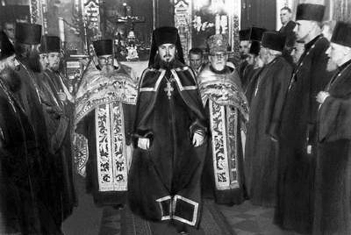 | Визит зарубежной делегации в Пюхтицкий монастырь в рамках ХМК. Богослужение в Успенском соборе совершает архиеп. Таллинский Алексий (Ридигер). 1964 г. |