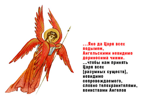 яко да Царя всех подымем, Ангельскими невидимо дориносима чинми – «…чтобы нам принять Царя всех [разумных существ], невидимо сопровождаемого, словно телохранителями, воинствами Ангелов».