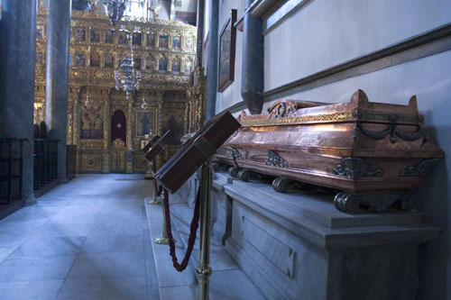 Патриархат – это несколько зданий XVIII-XIX веков за высоченным забором и без вывески. В светлое время суток здесь всегда открыто. Внутри тихо-тихо! Беломраморная чистота, солнце и ни души… Направо – резиденция Вселенского Патриарха, и если вам нужно общение хоть с кем-нибудь, то это туда. Там и дежурный есть, и секретарь. А если в церковь, то тогда от ворот Патриархата – вперед. Церковь Великомученика Георгия построена в начале XVIII века. Внутри очень красиво: стасидии темного дерева с головами грифонов на подлокотниках, золоченый резной иконостас. На завесе Царских врат – герб Константинополя и Вселенского Патриарха: двуглавый орел. И тоже ни души… Лишь изредка здесь можно застать одного-двух туристов или паломников. Последние приезжают сюда в основном из Греции, но бывают и россияне. Они знают: здесь хранятся драгоценные христианские святыни. Например, справа от иконостаса помещена колонна, к ней, по преданию, был прикован Господь во время предкрестных истязаний. Из колонны до сих пор торчит остаток кольца, к которому и приковали Спасителя. Считается, что эту святыню привезла в 326 году из Иерусалима св. царица Елена. В правой и левой частях храма, вдоль южной и северной стен находятся раки с мощами святых: справа – останки святых жен, а слева – мужей. Справа можно поклониться мощам свв. Евфимии Всехвальной, Соломонии и Феофании.
