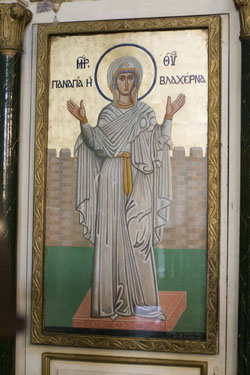 Под Царьградом, видимо, залегают гигантские водоносные слои. По всему городу видны действующие или заброшенные источники – то безымянные, то с надписями по-турецки или по-гречески, как источник св. Харлампия на набережной вблизи Фанара. Многие из этих источников почитались жителями Константинополя как чудотворные. Один из самых известных – во Влахернском храме (названном так по принадлежности к местности – Влахерны), точнее, в сохранившейся небольшой его части. Храм был построен над источником в V веке и знаменит тем, что когда-то здесь хранились риза, головное покрывало и часть пояса Пресвятой Богородицы.
