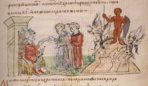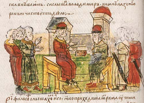 | Среди гостей был и присланный из Византии философ, проповедоваший князю Православие. По словам летописи, Владимир сразу проявил к нему особый интерес, потому как именно эта вера «запала ему в сердце», однако окончательное решение он все равно принял не сразу, а до времени отпустил философа «с честию великою». Впереди было крещение самого князя, совершившее настоящий переворот в его душе и, если верить летописцам, ничего не оставившее от былого язычника-душегуба. |