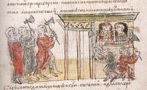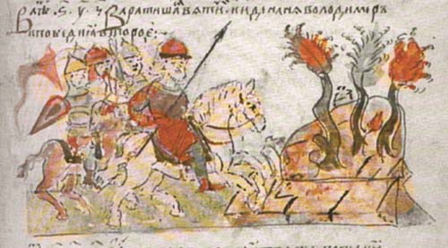 | В 983 году Владимир совершил удачный поход против ятвягов и еще на обратном пути в Киев начал приносить жертвы богам в честь своей победы, по возвращении же в столицу ближайшие бояре предложили князю принести в жертву человека. |