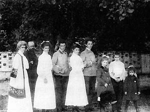 | Семья Осоргиных в Сергиевском 28 августа 1906 года. Мальчики одеты в форму студентов Московского университета. Слева направо: Лиза, Михаил Михайлович, Софья, Михаил, Ульяна, Сергей, Мария, Георгий, Тоня |