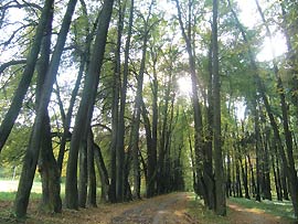 В ста метрах от колокольни находится липовый парк усадебного дома. Первый раз в моей жизни я видел целый «лес» высоких старых лип. Парковой ограды больше нет, но главная аллея, пересекающая весь парк, различима по сей день. Особенно хороша трехсотметровая лиственничная «Аллея любви».