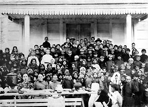 | Учащиеся церковно−приходской школы, построенной в 1887 году. Лето 1916 года |