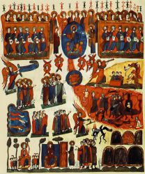 Миниатюра учительного Евангелия повторяет классическую композицию Страшного Суда, о которой некогда писал в своих «Очерках о русской иконе» князь Евгений Трубецкой: здесь «человеческая совесть иконописца стремится угадать Божий Суд не о каком-либо частном явлении, а о человечестве, как целом, более того — о всем мире. Те образы, которыми он олицетворяет этот Суд, превосходят глубиной и мощью самые вещие из человеческих слов».