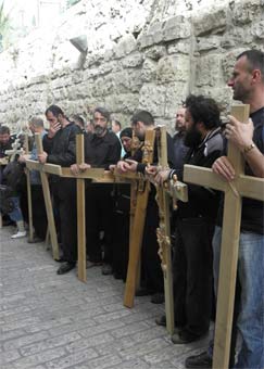 Наконец появился митрополит, и крестный ход тронулся к храму Воскресения. С криками телохранители владыки прокладывали ему путь, потому что торговая жизнь на узких улочках Старого города вовсе и не собиралась замечать многолюдное шествие. Особенно после седьмой остановки стало трудно: с обеих сторон арабы, расставившие какие-то газовые плиты, разложившие одежду и бижутерию на прилавках, отчаянно защищали свои торговые места, так что проход превратился в тропинку.