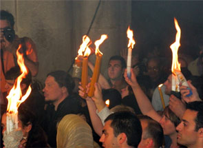 Хотя до Кувуклии рукой подать, разглядеть что-то было трудно. Но мы ощущали себя частью единого народа, ждущего Огня. Душа откликнулась, ожила после всех перипетий ожидания, когда арабы на чистом русском стали восклицать: «Наша вера правая, вера православная!!!» Вскоре Патриарх Иерусалимский Феофил зашёл в Кувуклию. Народ задвигался. Засверкали вспышки фотоаппаратов. Но через десять минут этого оживления вдруг наступила какая-то напряжённая тишина. Нет, не тревожная, не безнадёжная, но томительная. Все замерли. Когда же Огонь? (Впоследствии мне многие говорили, что именно через 10 минут чувство томительного ожидания воцарилось в храме.)