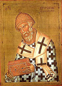 Был св. Спиридон и христианским мудрецом, и служителем Церкви, и исцелителем, и защитником простых людей. Однажды несчастная мать принесла ему своего мертвого младенца, вопия о помощи. По молитве святого младенец ожил, но пала бездыханной мать, не выдержав радости. Святой вновь начал читать молитву, и к женщине тоже вернулась жизнь. В другой раз его друг невинно попал под суд по навету и был приговорен к смерти. Святитель поспешил к нему на помощь, но путь ему преградил разлившийся ручей. Тогда святой приказал воде остановиться волею Христовой, так как он спешит спасти невинного человека. Вода чудесным образом остановилась, святитель благополучно переправился на сушу, и когда пришел в суд, там уже знали о случившемся чуде. Судья с почетом отпустил друга святого Спиридона.