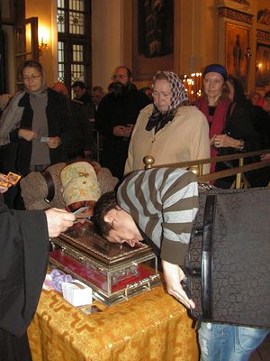 В самом соборе, где служится молебен и звучит хор, исполняющий акафист святителю Спиридону Тримифунтскому, смолкают даже отдельные приглушенные голоса. Людской поток, разделившись на два ручейка, устремляется к установленному недалеко от амвона золотому ковчегу со святыней. Каждый приложившийся к деснице чудотворца получает в дар маленькую иконку. Эти иконки заботливо заготовлены Даниловским монастырем с благословения патриарха Кирилла.