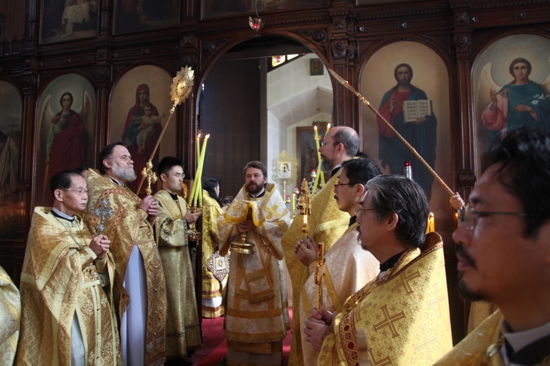 His Eminence Daniel, Archbishop of Tokyo and Metropolitan of All Japan, officiated at the celebration. Taking part in the celebration, with the blessing of His Holiness Patriarch Kirill of Moscow and All Russia, was a delegation of the Russian Orthodox Church led by Metropolitan Hilarion of Volokolamsk, chairman of the Moscow Patriarchate’s Department for External Church Relations (DECR). The delegation consisted of Archbishop Theognost of Sergiev Posad, abbot of the Lavra of the Holy Trinity and St. Sergius; the DECR deputy chairman archpriest Nikolai Balashov; DECR staff members hierodeacon Ioann (Kopeikin), L. Sevastianov and S. Petrovsky; and clerics and laymen of the Russian Orthodox Church.