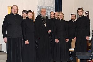 Часть студентов, поющих в семинарском хоре, вместе с иеромонахами Симеоном и Игнатием посетили онкологический центр, где после причащения больных детей наши воспитанники дали небольшой концерт.