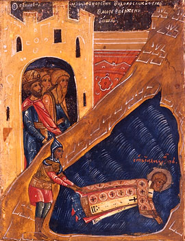 «Вскоре он [игемон] заметил, – читаем в “Житии священномученика Климента, папы Римского”, – что все они в душе стали мучениками и готовы на тысячи смертей. Что делать? Он оставляет их многочисленное общество в покое, опасаясь, чтобы окончательно не учинить здесь сонм мучеников за веру, объявляет одним виновником Климента и всю ярость обрушивает на его блаженную главу. И поскольку для Климента все мучения были легки и душеполезны и своими страданиями он большую доставлял безопасность прочим христианам, то игемон присуждает ему скорое и немедленное разлучение с жизнью. И, вывезши мученика на середину моря и привязав на шее его железный якорь (котву), опускает в глубину, дабы и тело его, по расчету игемона, не досталось христианам. Оно было ввергнуто в море, а множество христиан, стоя на берегу, плакали, жалостно стенали и печальнейшими воплями призывали патриарха. Корнилий же и Фив, ученики Климента, и сами вопили то, что внушило им горе, и, не зная, какое утешение предложить в несчастии, сказали: “Помолимся все единодушно, чтобы мощи мученика были явлены нам”«.