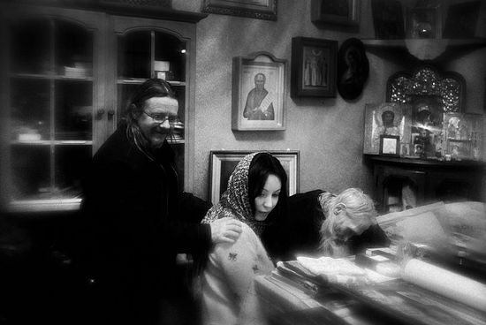 Дверь открывается, и в коридор выходит худой согнутый старичок. Его седая борода свисает до пояса черной рясы. Он делает шаг к скамейке, женщины вскакивают, сложив ладони для благословения.