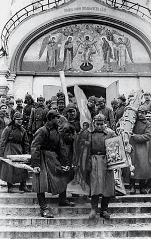 Тем не менее, большевики настолько недвусмысленно объявляли себя атеистами, что как-либо обойти это невозможно. В своей программной статье "О значении воинствующего материализма", написанной для журнала "Под знаменем Марксизма", В.И.Ленин пишет о насаждении атеизма как о "самой важной" задаче большевиков: "Самое важное — чаще всего именно это забывают наши якобы марксистские, а на самом деле уродующие марксизм коммунисты — это суметь заинтересовать совсем еще неразвитые массы сознательным отношением к религиозным вопросам и сознательной критикой религий.... Такой журнал должен быть, органом воинствующего атеизма.…. Чрезвычайно существенно поэтому, чтобы в дополнение к работе соответствующих государственных учреждений, в исправление ее и в оживление ее, журнал, посвящающий себя задаче — стать органом воинствующего материализма, вел неутомимую атеистическую пропаганду и борьбу"