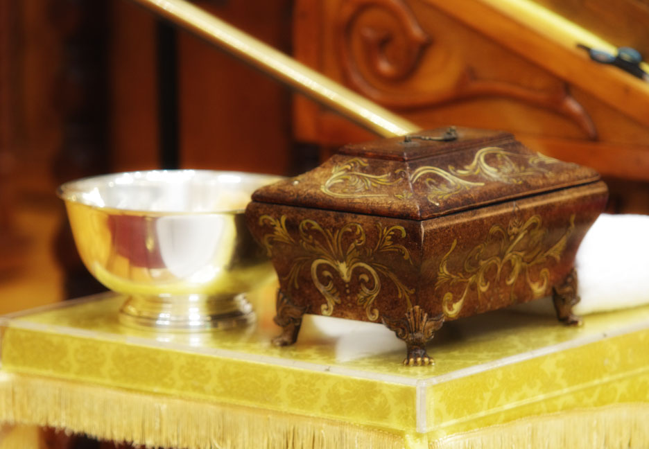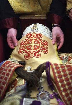 Pre-assigned groups of clergy then moved the reliquary and its stand from the shrine to the center of the cathedral, behind a long table covered with (and placed upon) sheets of white linen. All the priests took their places on either side of the reliquary by rank, with the Archbishop upon his cathedra at the head, and their hands were washed by the readers. The deacons ascended the amvon, and censed continually during the service.