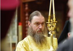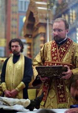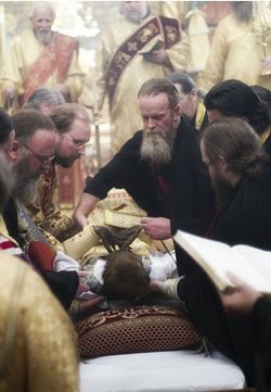 The rite began about 8:30 pm. The doors of the Cathedral were locked, and the Moleben Before the Beginning Any Good Work was served before the relics of the Saint. This was followed by the Magnification (Velichanie), after which the clergy venerated the relics. Archimandrite Irenei gave a brief exhortation, reminding us that while none of us was worthy to participate, our love and duty to the Saint required us to fulfill our obedience.