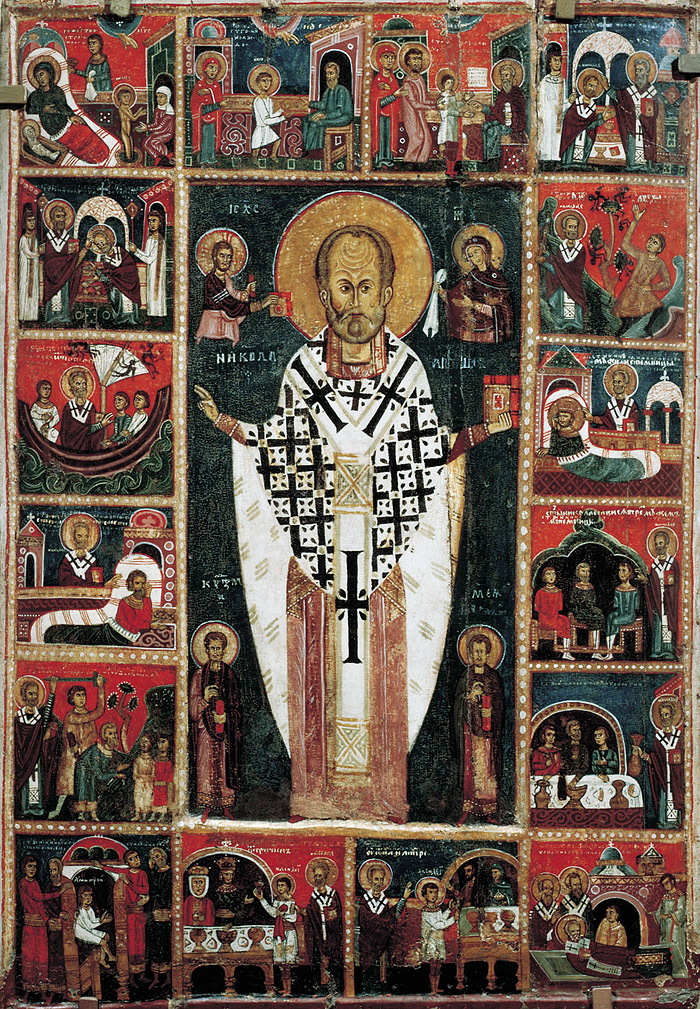 Икона святого Николая чудотворца с клеймами Об этом невольно думаешь, произнося отпусты. Ежедневно поминаются святые, к именам которых, как гвардейское достоинство к воинскому званию, добавлено слово «чудотворец». Такой-то «всея Руси чудотворец», такой-то «победоносец и чудотворец». Через людей, так поименованных, как сквозь чисто вымытое стекло, лился при жизни и продолжает литься ныне Божий свет. Бог, как источник силы, мира и чудес, проводит обильно через этих людей Свои дары и через них реализует Свои планы. И возникает мысль: почему одни так обильно проводят Божественную силу, словно вода – электричество, а другие нет, словно они по отношению к тому же электричеству резина и дерево?