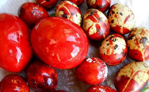 Если же вы не используете покупные красители и хотите получить традиционную, насыщенно красную скорлупу, давно пора озаботиться сбором луковой шелухи – её понадобится много. В том случае, если лук в вашей семье расходуется скромно, можно заглянуть на рынок и попросить мешочек шелухи у продавцов овощами.