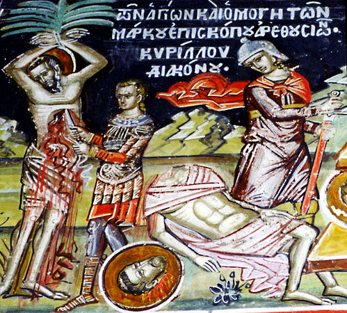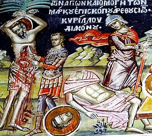 В ту же эпоху Кирилл, диакон в Илиополе Финикийском, который также разрушил немало идолов во времена св. Константина, был схвачен язычниками. Они разрезали ему живот, разбросали внутренности по земле и съели его печень сырой. Виновные в этом бесчестии подверглись впоследствии отмщению Божию: одни потеряли все зубы, языки других подверглись гниению, а третьи лишились зрения.