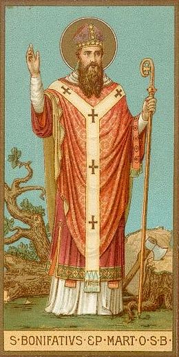 Винфрид пересек Ла-Манш осенью 718 года и уже больше не возвращался в Англию. Спустя несколько недель он в первый раз встретился с другим будущим святым – папой Григорием II († 731), носившим то же имя, что и апостол англов святитель Григорий I. Было еще много встреч с папой: Григорий II испытывал усердие Винфрида. В мае 719 года папа нарек Винфрида новым именем – Бонифаций (Вонифатий) – в честь святого мученика Вонифатия Тарсийского († 307; память 19 декабря. Тарс – родина святителя Феодора Кентерберийского). В переводе с латыни имя Бонифаций означает «творящий благо». Папа поступил так же, как до него другой папа, изменивший в 695 году имя первого великого английского миссионера: святого Виллиброрда он нарек Климентом. С именем Бонифаций подвижник прожил до конца дней своих, и именно под этим именем его все и знают.