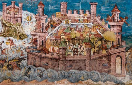 Союзные итальянцы перевезли семьи в защищённую «нейтральную» генуэзскую колонию Перу на другом берегу залива Золотой Рог, они рассчитывали «в случае чего» уйти на кораблях в море, грекам же оставалась только «холодная отвага отчаяния» (о которой, в своё время, применительно к «старым римлянам», воевавшим с Карфагеном, писал Честертон), но не было тут никакой «холодной отваги», а был трагизм последних дней смертельно больного человека... Так в стылом ноябре умирал «русский византиец» Константин Леонтьев (в монашестве Климент), об этом писал Георгий Иванов: «„Надо покориться“, — в жару, в полубреду уговаривает он себя и сейчас же сам себе возражает: „Ещё поборемся“, — опять: „Надо покориться“, — и снова: „Ещё поборемся“ ...» И, возможно, именно с монгольскими погромами Руси, победой турок на Косовом поле, с взятием Константинополя наши церкви, православные люди словно бы выучились плакать, «печаловаться», как будто принимая в свой исторический опыт, в своё сердечное чувство слова Господа Иисуса Христа в одном из самых трагических мест Евангелия: «Теперь веруете?..» — в своей скорби, в своём рассеянии, в поражении...