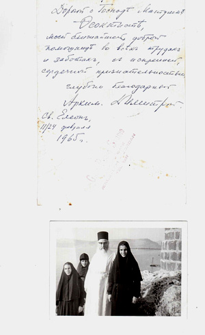 | Дарственная надпись о. Димитрия. <br/> Отец Димитрий среди монахинь. Слева от него - матушка Тамара. |