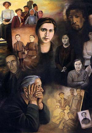 Вот на первой части триптиха реальная объёмная фигура бабушки, фотография перед ней — и череда воспоминаний: она сама, юная и красивая; лицо её мужа, арестованного и убитого в 1937-м и посмертно реабилитированного; опять она сама, с лицом серым и окаменелым после 37-го года, после войны, и лица, лица ушедших людей, память о которых ей уже не с кем разделить.