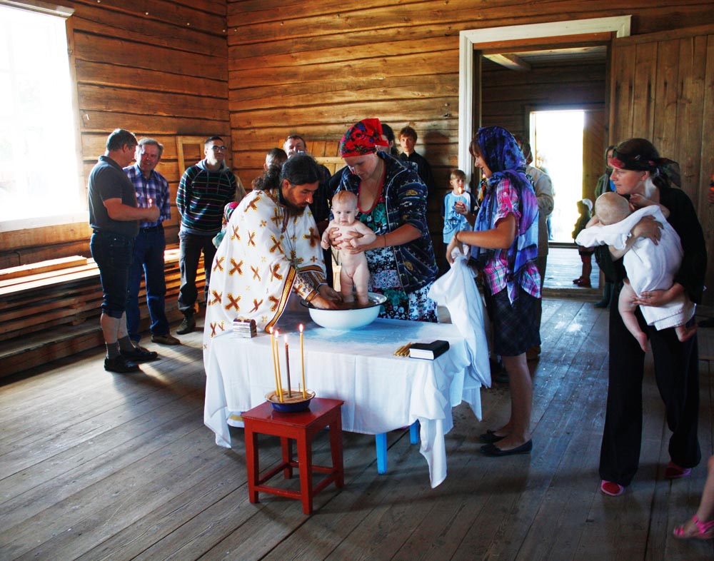 Теперь, год спустя, мы снова вернулись сюда. Приехали те, кто восстанавливал деревянные северные храмы в прошлом году, присоединились новые люди. Мы побывали в деревнях, где нас уже знают по прошлому году, приехали в еще незнакомые места. В самых крупных храмах отслужили Божественную литургию. В одной деревне практически полностью отремонтировали часовню, в других – залатали крышу в храмах, убрали мусор, стерли надписи, повесили иконы. Помогли местным жителям сплавить лес для реставрационных работ с одного берега Онеги на другой. 27 местных жителей приняли Крещение, более 100 причастились. Для мест, где люди годами не видят священника, это значительные цифры.