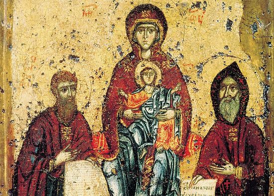 Свенская Печерская икона Божией Матери с предстоящими преподобными Антонием и Феодосием Киево-Печерскими. Фрагмент