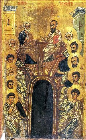 | Пятидесятница, сошествие Святого Духа на апостолов. Сер. XII в., Синай |