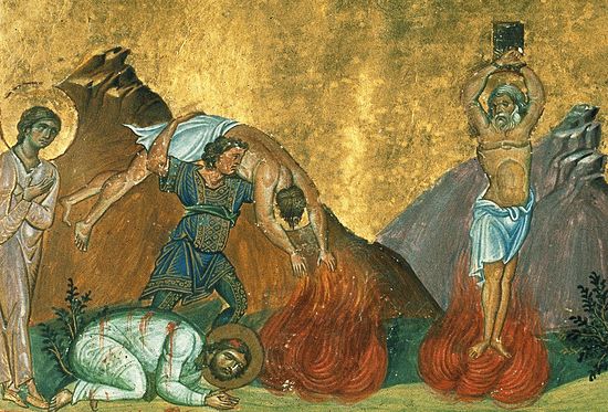 В тот миг, когда души обоих мучеников отошли к Богу, христианка по имени Агафоника[3] воскликнула: «И я тоже увидела славное торжество и желаю воссесть там, чтобы приобщиться к нему!» Несмотря на тщетные уговоры родных, напоминавших ей о долге по отношению к маленькому ребенку, она, отринув природную слабость своего пола, бросилась в огонь со словами: «Господи, помоги мне, ибо к Тебе я прибегаю!» Так ее душа отошла в небесные чертоги, чтобы разделить райское блаженство со сподвижниками.