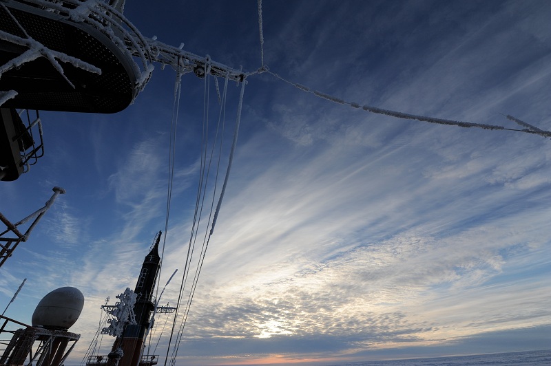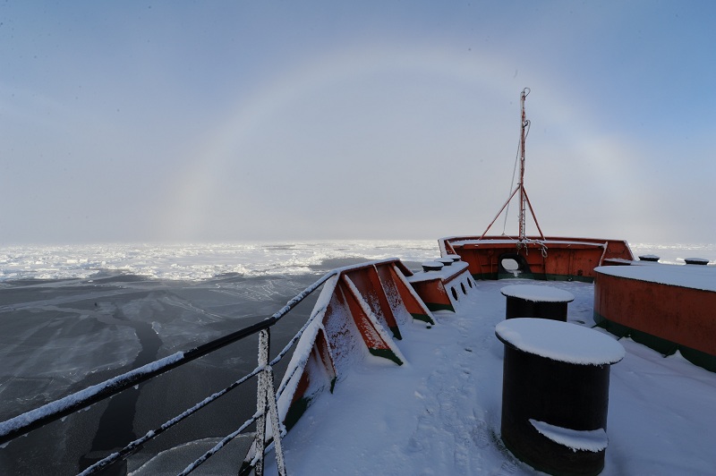 На небе ни единого облачка. Сияет солнце. А по обе стороны от него – две радуги. Оборачиваюсь к ледоколу. По борту – все, кто свободен от вахт.