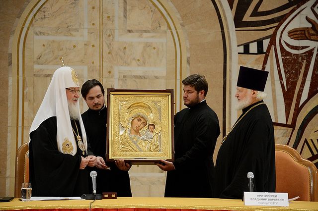Святейший Патриарх Кирилл обратился к участникам торжественного акта с Первосвятительским словом. Предстоятель Русской Церкви передал в дар ПСТГУ Казанскую икону Божией Матери с памятной надписью и благословил раздать студентам иконки Спасителя.