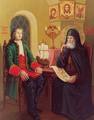 Святитель Митрофан (в схиме Макарий), епископ Воронежский, и царь Петр I Святитель Митрофан родился в 1623 году на Владимирской земле. Он начал служение Церкви в числе белого духовенства на сельском приходе. Овдовев в 39 лет, Митрофан поступил в Успенский Золотниковский монастырь под Псковом. Спустя всего три года он был призван игуменом в соседнюю обитель. Ведя строгую подвижническую жизнь, Митрофан стал заботливым и снисходительным отцом для монахов, отвечавших ему уважением и послушанием.