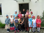 During the first session of 2011, 14 girls helped us prepare to greet a group of 50 pilgrims led by Berlin’s Priest Andre Sikojev and Abbess Nonna (Bagaeva) of Epiphany Convent in Alana and her nuns. There were children in the group who had survived the terrorist act in Beslan, and children from the ROCOR and MP parishes of Berlin. They were visiting the holy sites of Germany and arrived at our convent early in the morning. Liturgy was being celebrated by our dear “abbot,” Archbishop Mark of Berlin and Germany. Many partook of the Holy Mysteries, after which we hosted an outdoor reception for our guests. Our girls performed a little concert, and wore wonderful costumes as they performed the Ossetian dance called Molitva [“The Prayer”]. It was unforgettable. This was one of the cooperative efforts by the two branches of the Russian Orthodox Church.