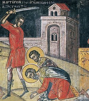 Тем временем в городе был проездом некий Иулиан, благочестивый каппадокиец, исполненный Духа Святого. Он бросился к месту, где лежали тела святых мучеников, и в великой радости стал обнимать их одно за другим. Он тут же был схвачен, и Фирмилиан приговорил его к сожжению на медленном огне. Со сверхъестественным веселием, громогласно восхваляя Бога, он присоединился к лику святых мучеников.