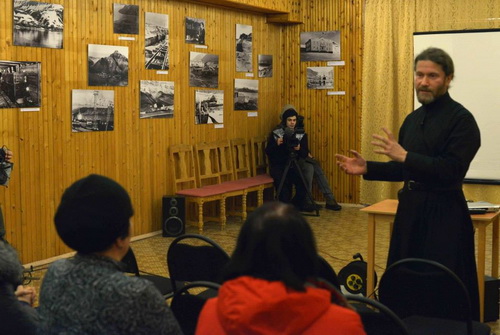 Я провел несколько бесед в библиотеке – мы говорили о смысле жизни, тайне смерти, и таинствах Церкви. Сегодня, накануне восьмого марта, буду разговаривать о значении женщины в Церкви. Показываю фильмы, которые с собой привез.