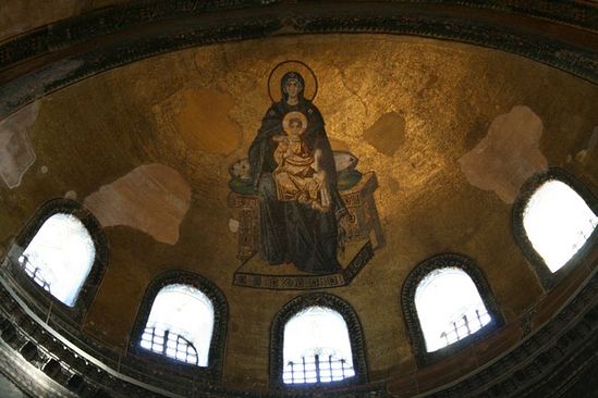Только с приходом на патриаршество святителя Фотия положение стало меняться. В 860 году воссоздаются мозаичные иконы в Золотом зале Большого императорского дворца, или Хрисотриклиния. В 863 году строится церковь Богоматери Фаросской – этому храму суждено позднее стать хранилищем императорских реликвий[23]. И, наконец, в 867 году в Святой Софии был восстановлен образ Богоматери, а также изображения апостолов и пророков[24].