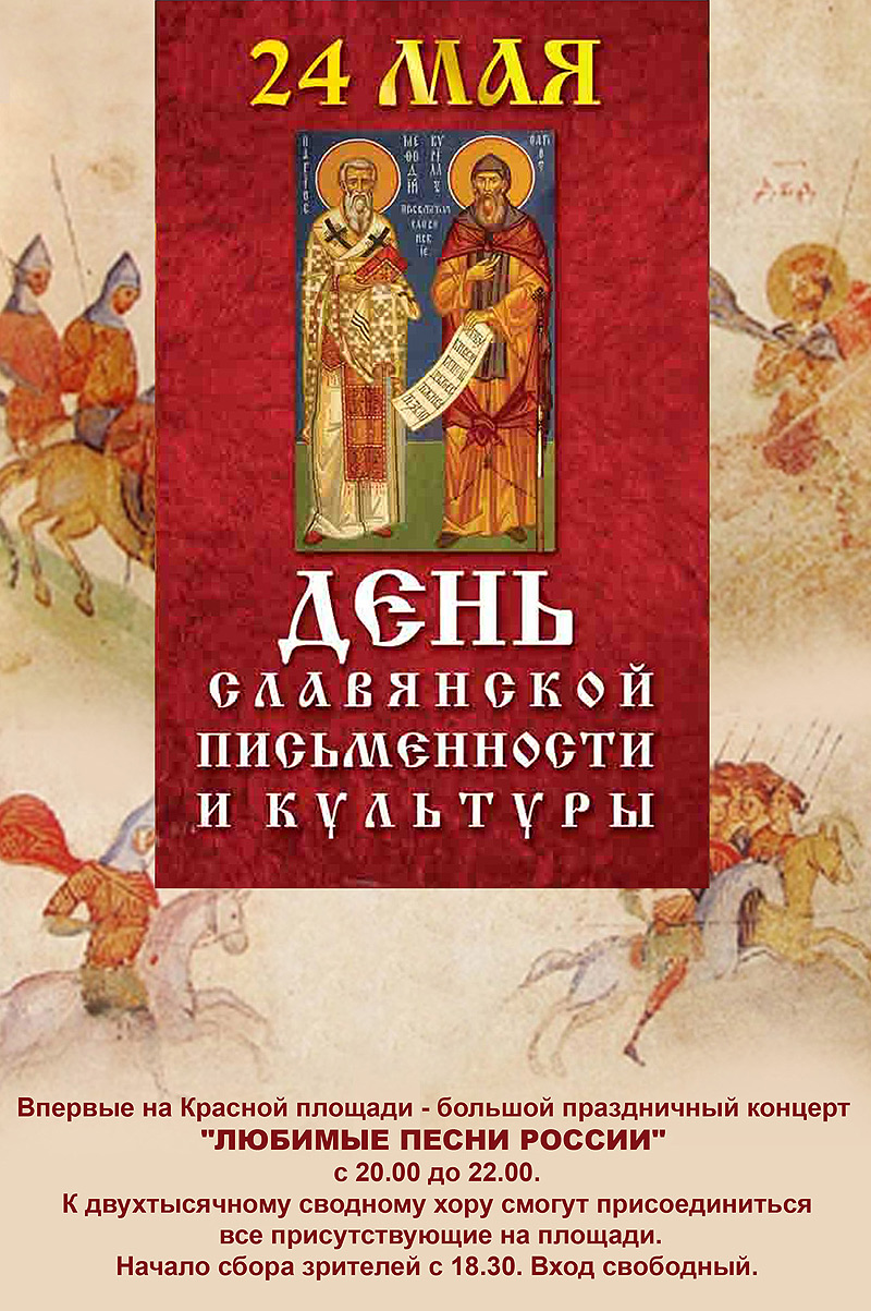 Дан словенске писмености и културе је уприличен на дан свете равноапостолне браће Методија и Кирила (IX). У Русији се празник слави сваке године у складу с Одлуком Президијума Врховног Савета РСФСР од 30. јануара 1991. године. Од 2010. године Москва је постала центар празничних свечаности.