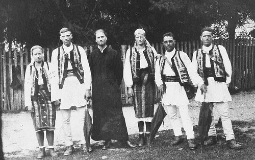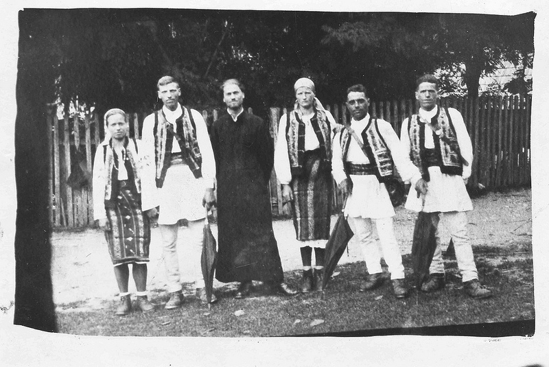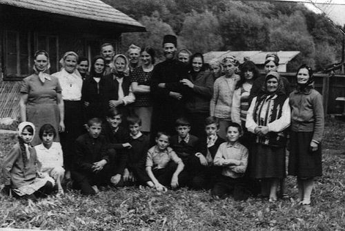 Отец Иустин в селе Петру Водэ в окружении своей семьи и верующих, ок. 1970 г.