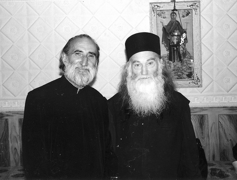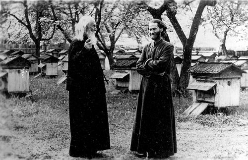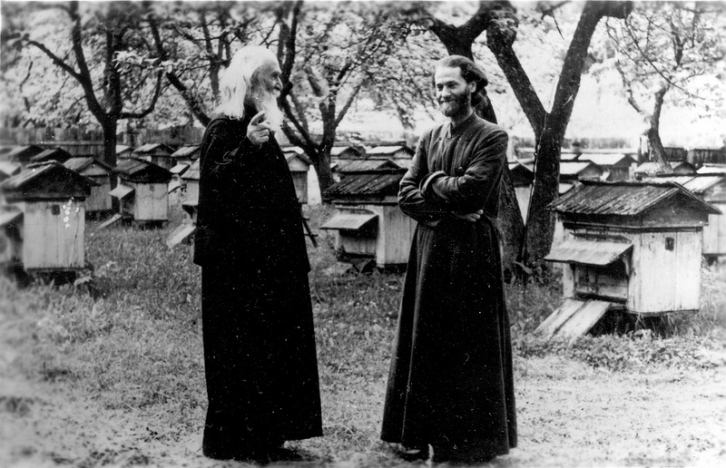 Отец Иустин со своим духовником, протосингелом Епифанием (Акатриней), на пасеке монастыря Секу, где он проходил одно из первых послушаний после освобождения, 1967 г.