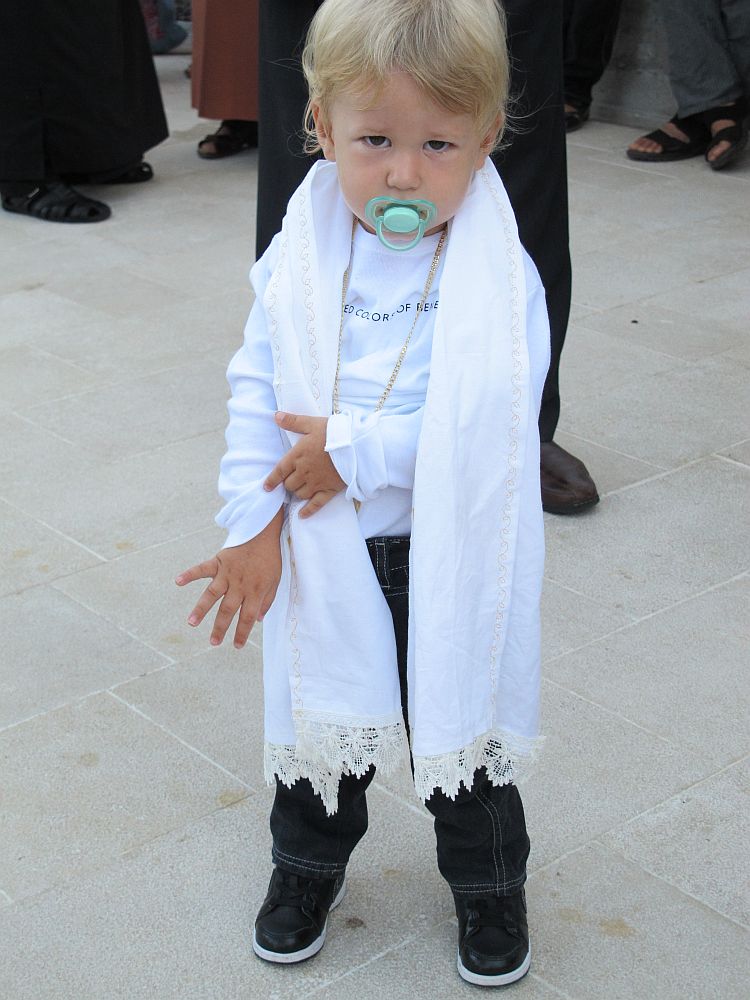 Сына Кристо крестили в день освящения храма Александра Невского — в честь святого Александра, которому благодарны за предстательство. В Сербской Православной Церкви крещальная литургия отличается от обычной: крещение происходит перед службой. Миропомазание совершал митрополит Амфилохий перед чтением Апостола, и вокруг аналоя ребенка носили под пение «Елицы во Христа крестистеся, во Христа облекостеся». Детский плач попадал в микрофоны на равных правах со словами архиерейских молитв.