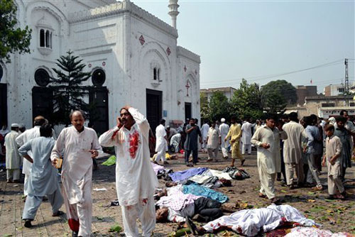 Корреспонденты передают слова офицера-сапера пакистанской армии, согласно которому два смертника взорвали себя в толпе прихожан у выхода из церкви Всех святых.