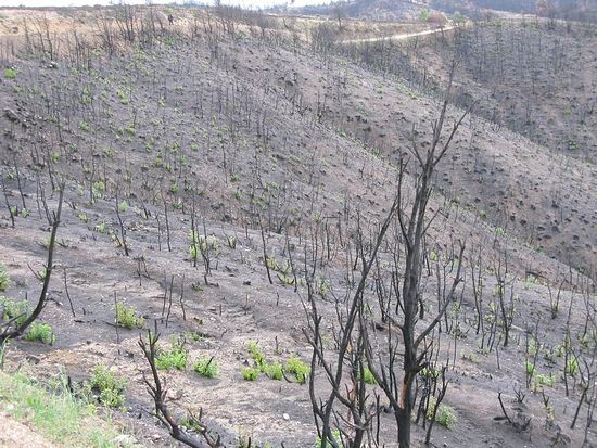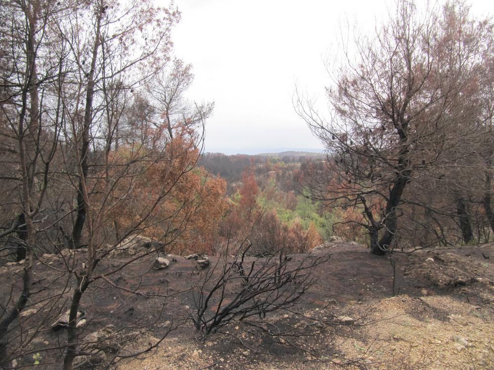 Стоя наверху и видя перед собой всю перспективу до горизонта, мы были несколько обескуражены. В августе 2012 года здесь почти все выгорело, и поэтому Святая Гора прекрасно просматривалась на многие километры вперед.
