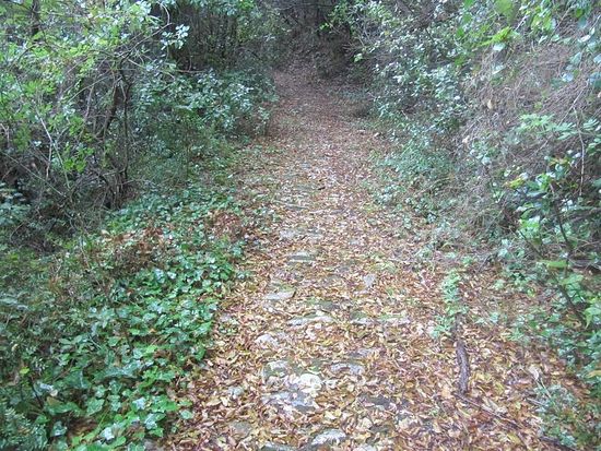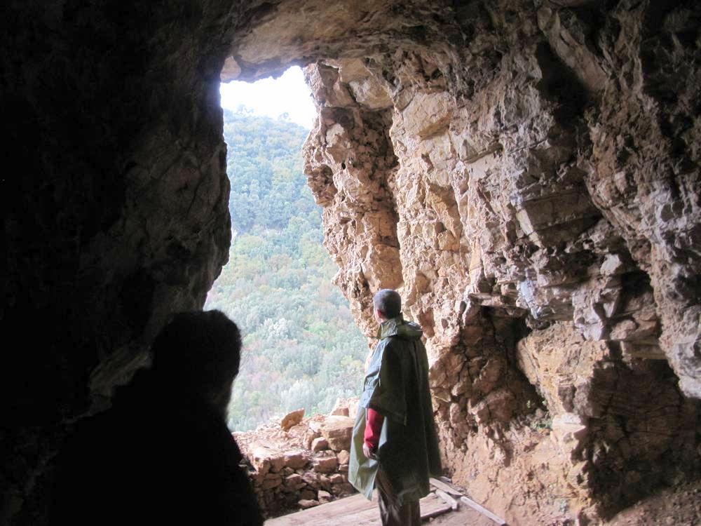 Расставаясь, распрощались друзьями, и обещали помолиться за него на вершине Афона. Хороший человек, дай ему Бог здравия. Денег он конечно же не взял, просто наотрез отказался. Если бы он нам не показал начало тропы, то весьма сомнительно, что мы бы нашли ее вообще, а наши поиски могли закончиться в итоге ночевкой где-то под мокрым кустом на непрекращающемся до самой ночи дожде. Что конечно же не входило в наши планы на сегодня. Еще раз спасибо тебе Матушка Богородица за оказанную милость. Тропа древняя, наверное 1000-летняя, идет от Хиландара сербского в Зограф болгарский. Красивая тропа, идешь, как в сказке, под ногами мягкий ковер из опавшей листвы, под ними обточенные ногами, молитвами и тысячелетием камни, а сверху арка из густо нависающих деревьев и кустарника. Уже при подходе на дороге появился указатель к пещере преподобного Космы Зографского. Мы поднялись в его пещеру на скале. Место живописное, это было видно даже в пасмурную погоду. Моли Бога о нас, святый отче.